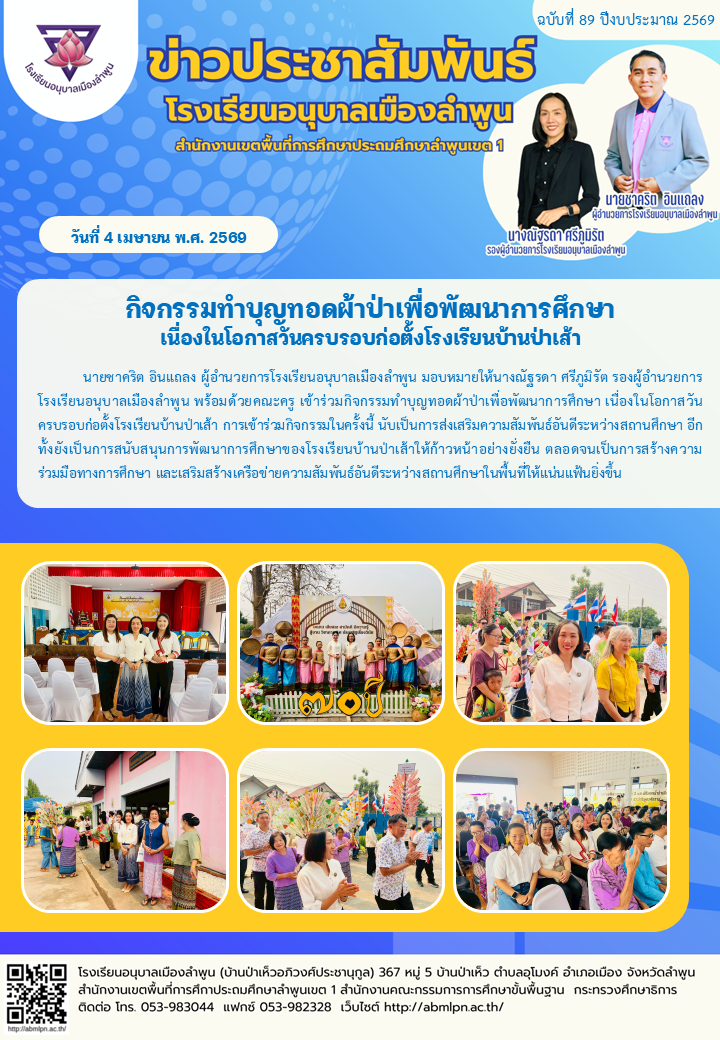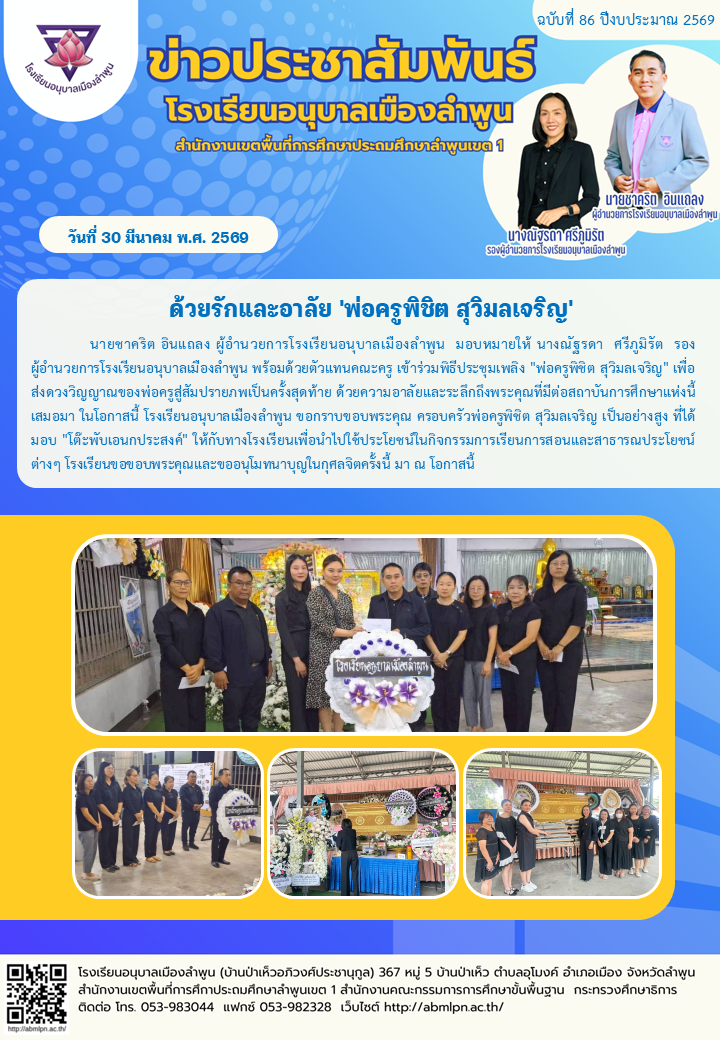 - 27 ก.พ. 2569 ประกาศร่างประกวดราคาจ้างก่อสร้างอาคารเรียน แบบพิเศษ โรงเรียนอนุบาลเมืองลําพูน จํานวน 1 หลัง ด้วยวิธีประกวดราคาอิเล็กทรอนิกส์ (e-bidding)